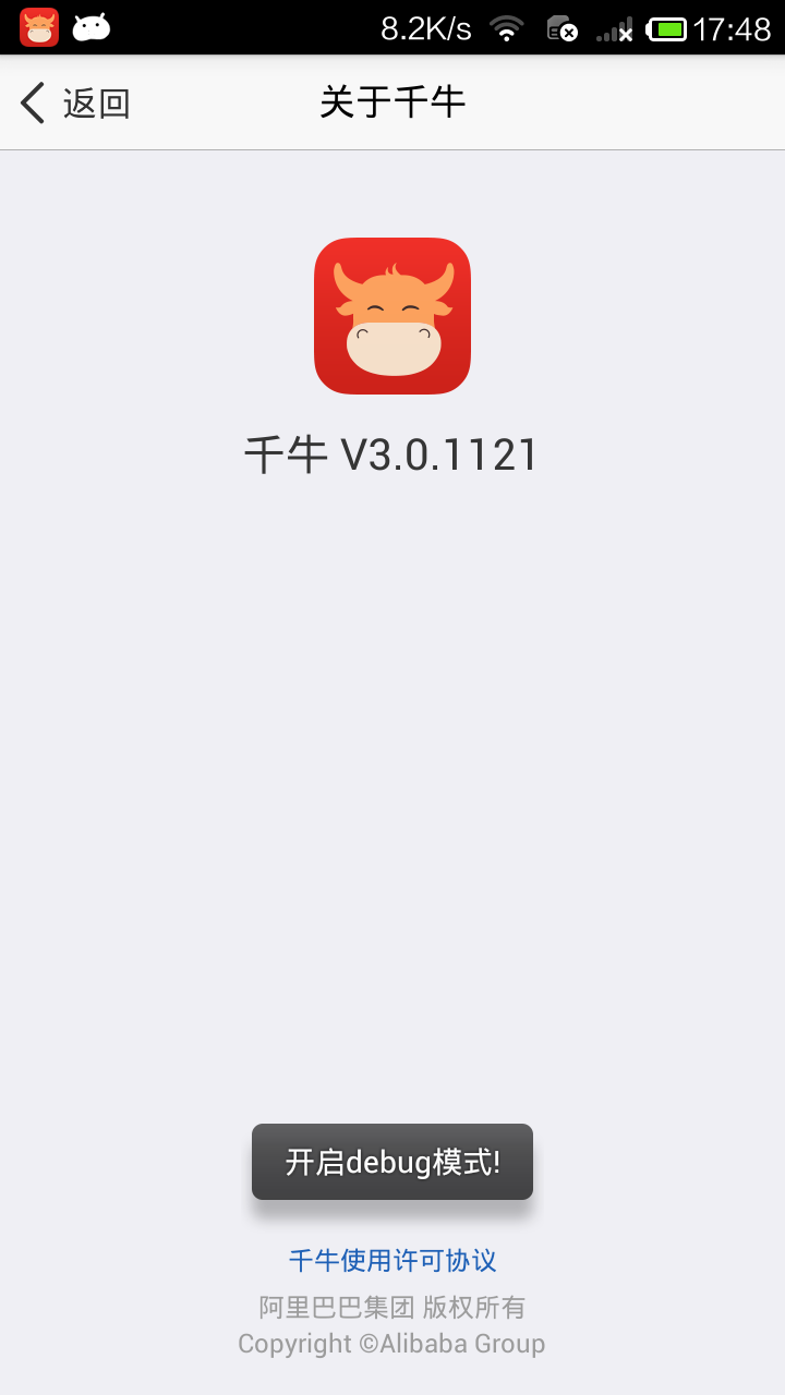 进入“设置”à“关于千牛”,在如下界面点击千牛图标大于等于10次开启debug模式,开启后会有提示如下图:
