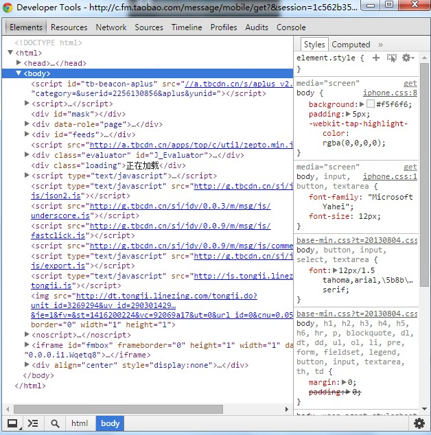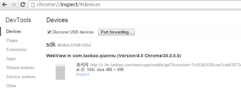 在Android App中打开某个需要调试的WebView页面。然后在PC Chrome中打开”chrome://inspect“页面: