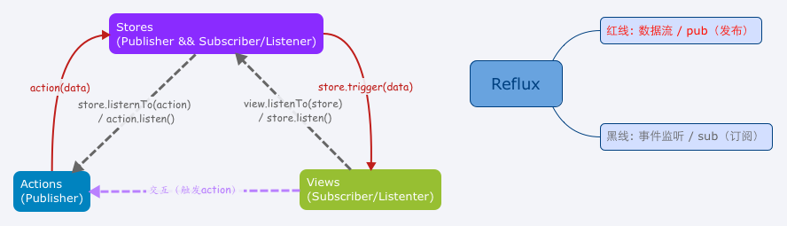 当然,作为应用数据处理的模式,除了Flux,还有很多(如:传统的MVC,MVVM),只是Flux凭借其单向数据流特点,使得数据流变得简单,易于调试和追踪问题,所以更适合与React进行组合使用。