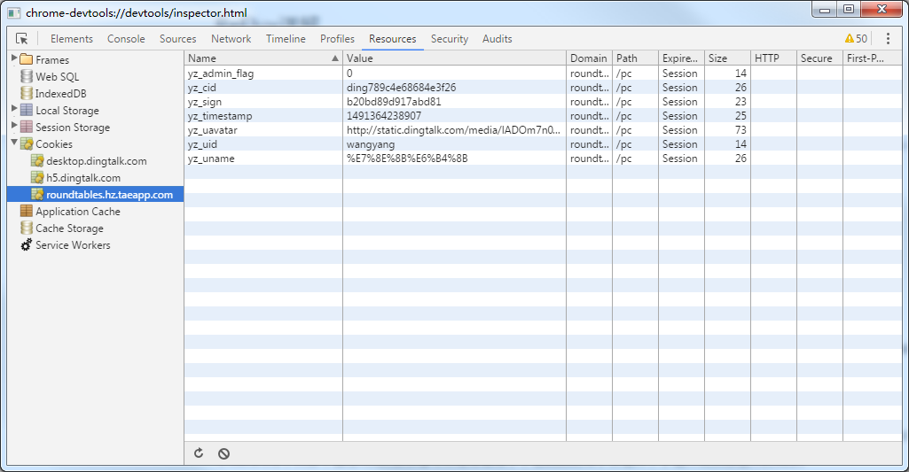 解释一下:左边栏Cookies下方会列举当前网页中设置过cookie的域都有哪些。上图中只有一个域,即“ppsc.sankuai.com”。而右侧区域显示的就是某个域下具体的 cookie 列表,对应上图就是roundtables.hz.taeapp.com域下设置的7个cookie。