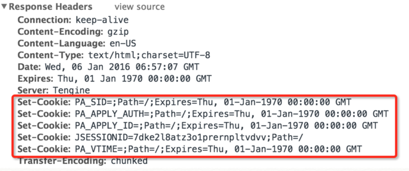 不管你是请求一个资源文件(如 html/js/css/图片),还是发送一个ajax请求,服务端都会返回response。而response header中有一项叫set-cookie,是服务端专门用来设置cookie的。如下图所示,服务端返回的response header中有5个set-cookie字段,每个字段对应一个cookie(注意不能将多个cookie放在一个set-cookie字段中),set-cookie字段的值就是普通的字符串,每个cookie还设置了相关属性选项。