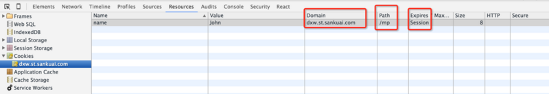 查看浏览器cookie 面板,如下图所示,新的cookie设置成功了,而且属性选项 domain、path、expires都变成了设定的值。
