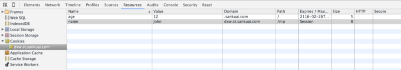 在网页即客户端中我们也可以通过js代码来设置cookie。如我当前打开的网址为http://dxw.st.sankuai.com/mp/,在控制台中我们执行了下面代码:1