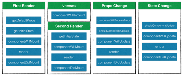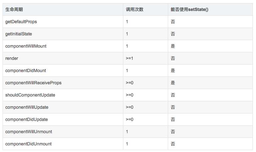 getInitialState、componentWillMount`、render和componentDidMount,但并不执行getDefaultProps`;当再次渲染组件时,组件接受到更新状态,此时按顺序执行