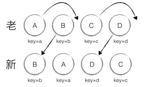 新老集合所包含的节点,如下图所示,新老集合进行 diff 差异化对比,通过 key 发现新老集合中的节点都是相同的节点,因此无需进行节点删除和创建,只需要将老集合中节点的位置进行移动,更新为新集合中节点的位置,此时 React 给出的 diff 结果为:B、D 不做任何操作,A、C 进行移动操作,即可。